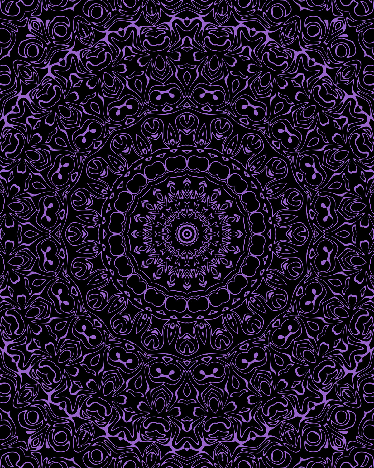 Dreamgazer is a series of fifteen designs, each one built from the same essential structure — deep black, a single color, and an intricate symmetrical form radiating outward from a central point. The colors range from warm and earthy to cool and luminous, from softly muted to sharply vivid. Within that consistent framework, no two designs feel quite alike. Some colors push forward against the darkness, others dissolve into it. Some compositions feel precise and architectural, others fluid and organic, their forms suggesting anything from carved stonework to poured liquid. Taken together they form something that functions both as a series and as a collection of individuals — related but distinct, each one worth lingering over.